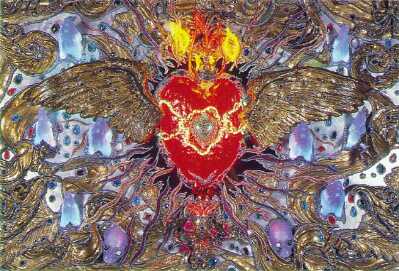 Cast glass skulls, praying hands, and slumped glass heart by Scott Zoog and Jason Lingnau. Commissioned by neon artist Lee Roy Champagne.